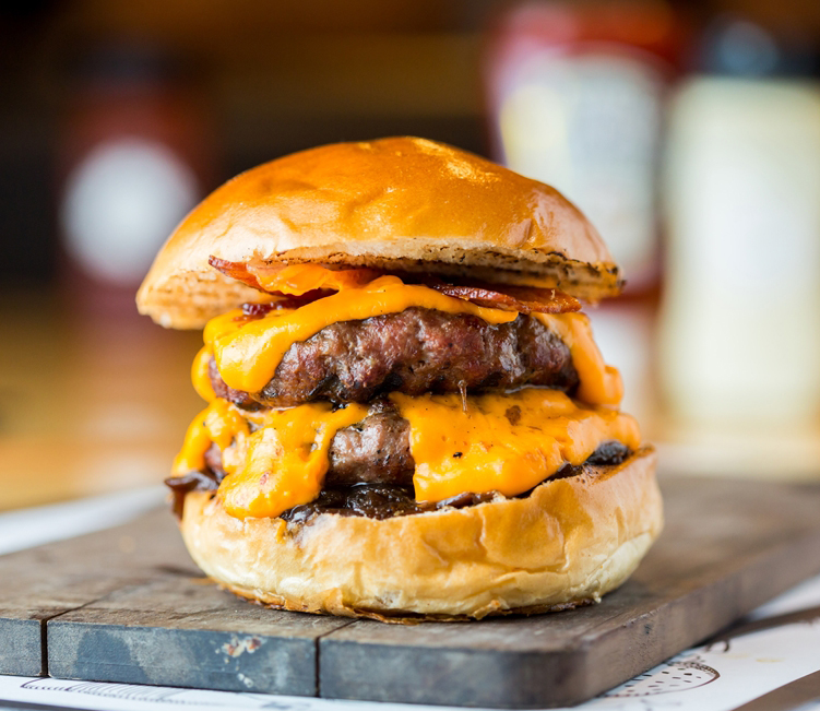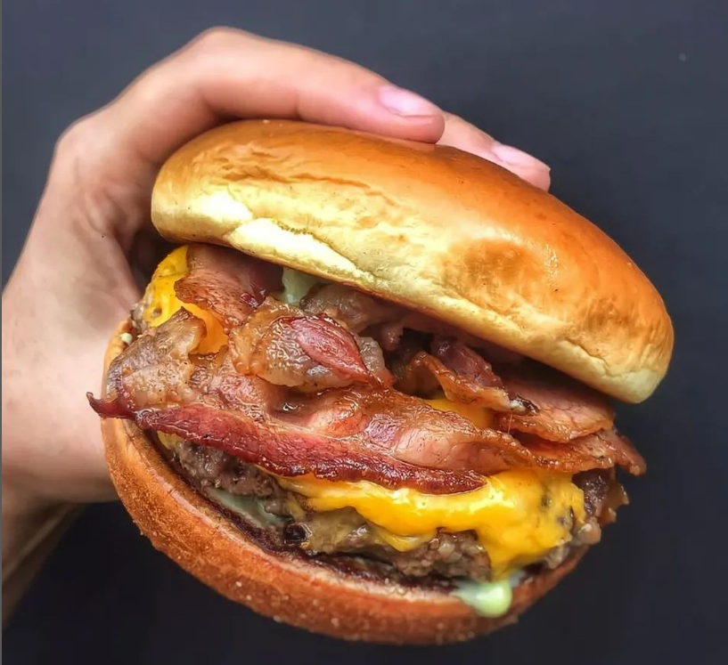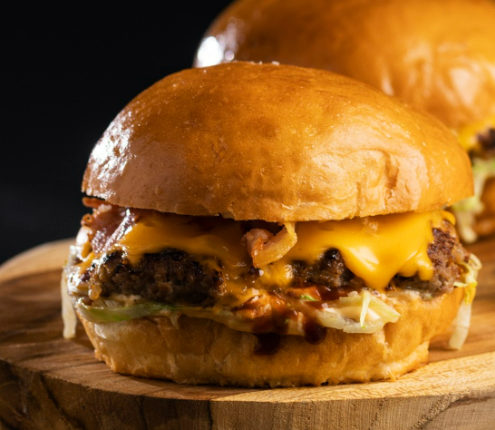 Pão brioche selado na manteiga, 2 blend carne 110g, queijo muçarela, cheddar em fatias derretido e molho especial